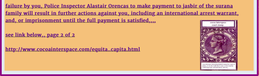 today the West Midlands Police under the authority of yourself and Police Inspector Alastair Orencas, committed criminal offences of aggravated criminal trespass,, daylight robbery and offences against children , we cocoa interspace international global common law court of justice, require you to respond to this email within next 3-days, due to further threats of continued unlawful criminality,, see EQUITA, CAPITA on left navigation bar on cocoa interspace international global common law court,,